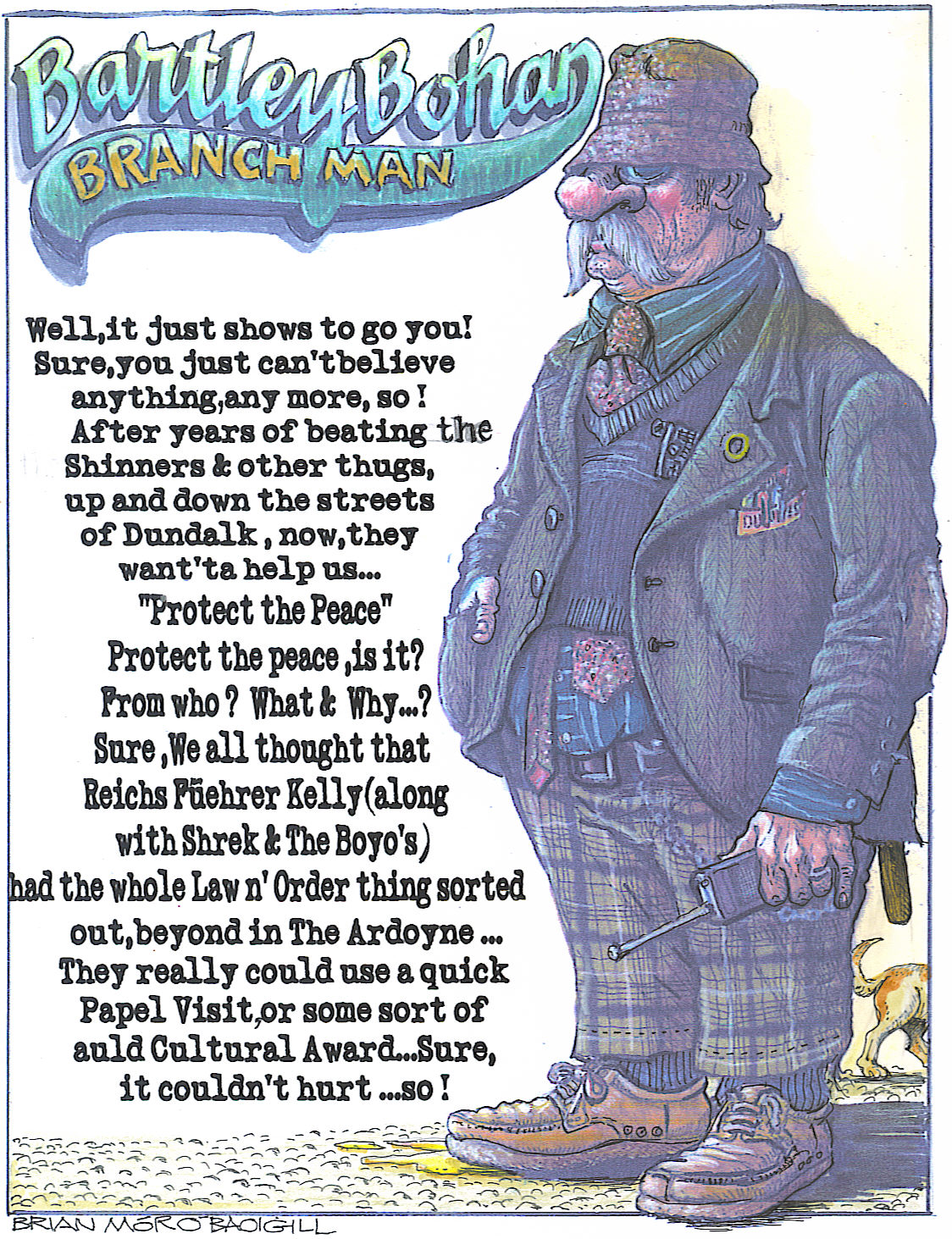Post conflict you appear to reside in a seemingly violent world. A myriad of features within that world either get the boot or get a whack. A Hallucinogenic place where reality becomes the surreal. An oaf on oaths and peoples parliaments. Confusion over the rationalisation of the British Army and a resounding IRA victory.
