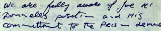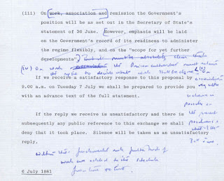 The British end of the channel, meanwhile, was working on the draft statement. Thatcher's input, handwritten on the British copy, informed the statement that went down the channel as a reply to the Adams Group at 11:30 that night.