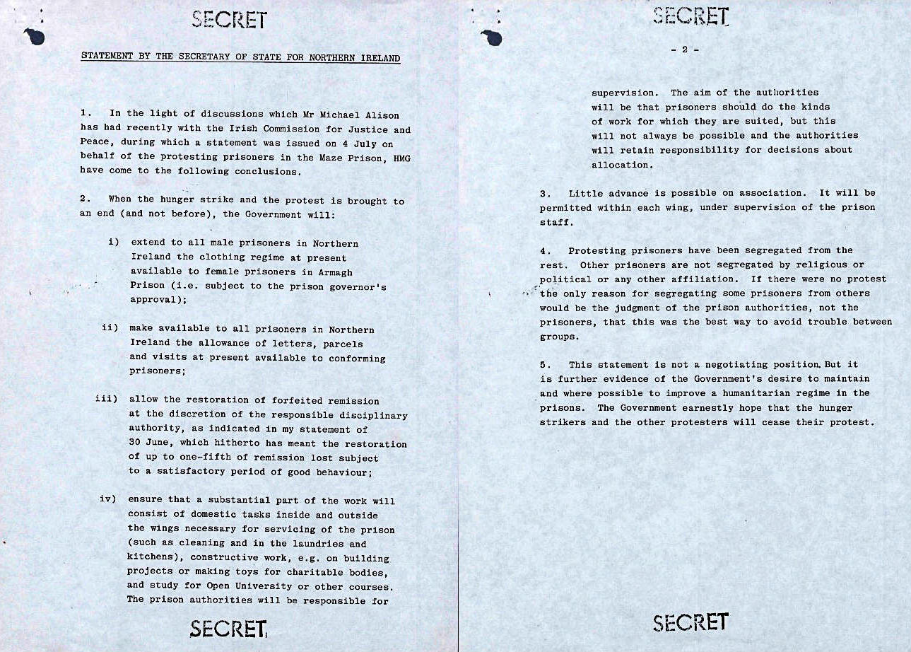 - In the light of discussions which Mr Michael Alison has had recently with the Irish Commission for Justice and Peace, during which a statement was issued on 4 July on behalf of the protesting prisoners in the Maze Prison, HMG have come to the following conclusions.